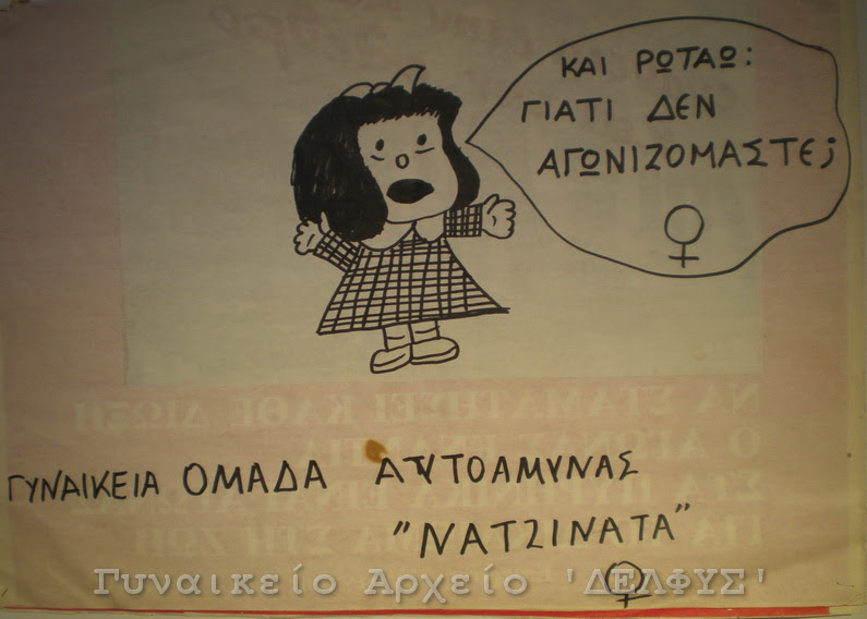 ___Οι Αφίσες και τα πλακάτ του Αυτόνομου Γυναικείου χώρου, καθώς και των γυναικείων οργανώσεων της μεταδικτατορικής περιόδου, αποτελούν ένα σημαντικό κομμάτι του υλικού του "Γυναικείου Αρχείου 'Δελφύς"(1).